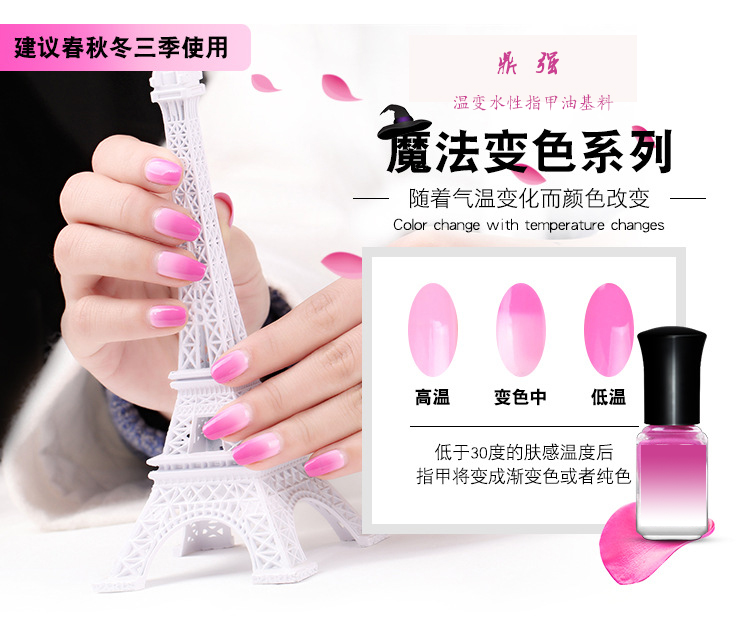 1. 环保水性不含有机溶剂,不伤害指甲,传统油性指甲油长期使用后会使指甲变黄、变脆、变形,而用温控变色(可剥)指甲油基料调配的水性指甲油就没有这种问题。