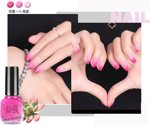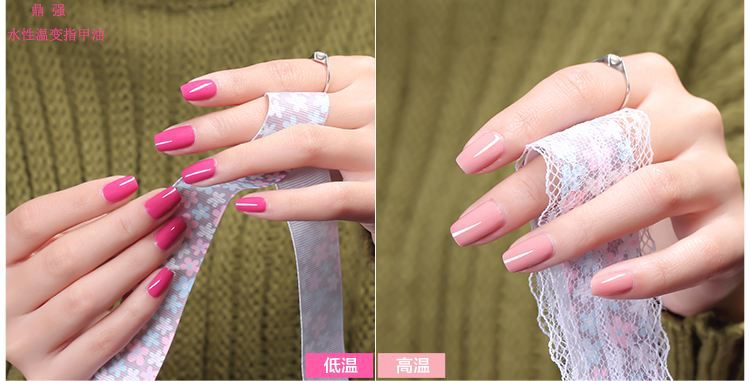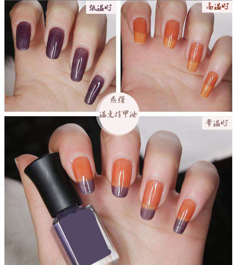 温变甲油遇高温变浅色,低温变深色。涂在指甲上会同时受手温和空气温度的影响!