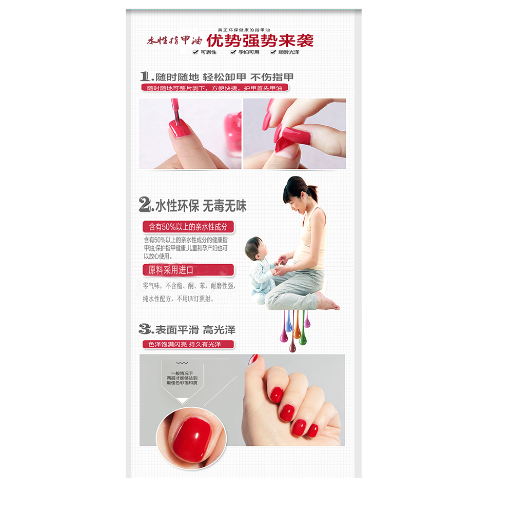 秉承着满足爱美女士对高品质产品的追求,国内首屈一指的专业甲油品基料,成品半成品类生产十年的中山鼎化工研发中心,历时5年,研究出颠覆传统油基指甲油的革命性产品——“天然、零刺激”的水性基料甲油配方,为时尚爱美女子提供100%健康安全的产品,使她们能尽情享受指尖的魅力、玩弄色彩的愉悦,却不再受任何有害物质的伤害。