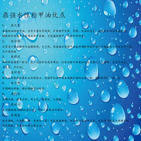 采用进口聚氨酯作为成膜物质,无气味,用鼎强水性指甲油基料调配的指甲油打开瓶盖闻不到有化学气味,不污染环境